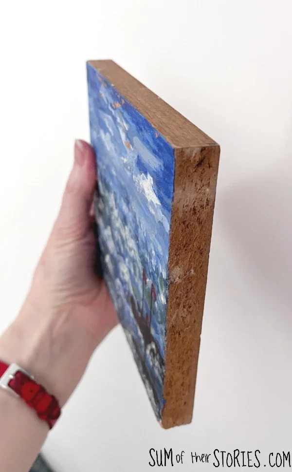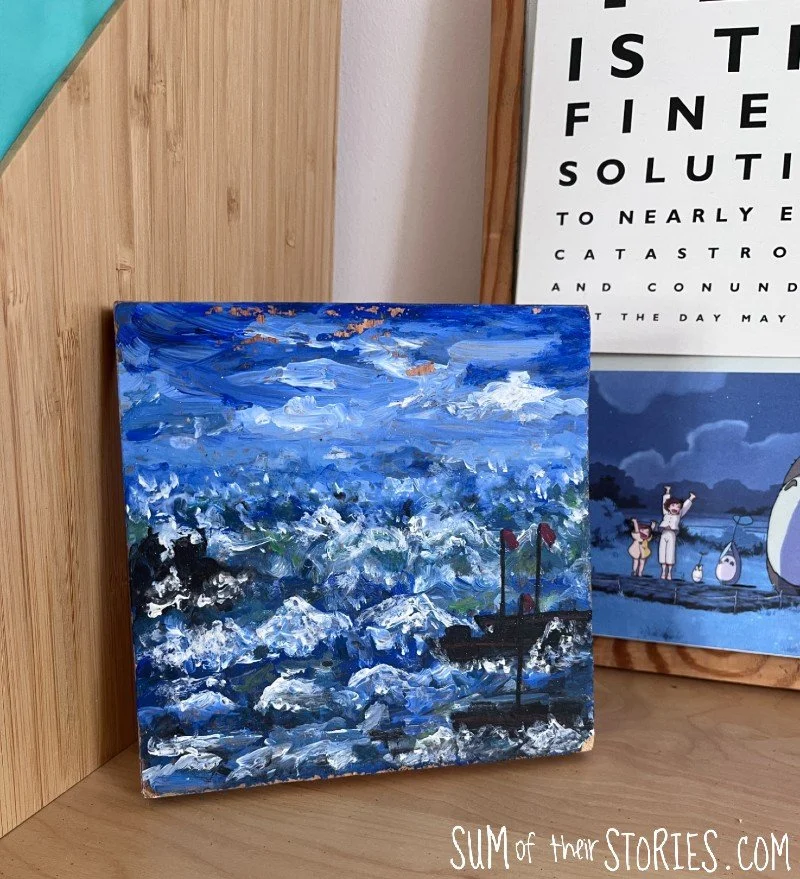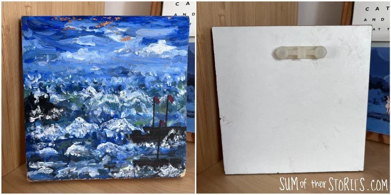 Rather than buying wood especially for her art experiments she rummaged in my grandad’s box of wood scraps in the garage and painted on what she found. This sea scape is painted on a bit of coated plywood left over from a kitchen refit, it’s still got some plastic element of the kitchen fitting attached to the back!
