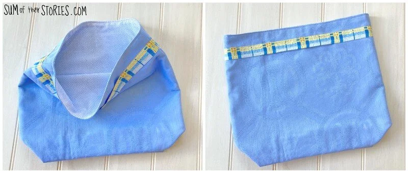 Turn the main bag piece right sides out and the place it inside the lining, carefully lining up the top edge and the side seams.