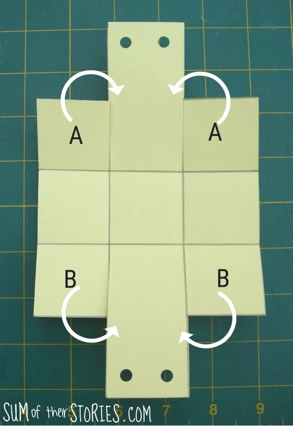 Fold the sides of the box up and then in. The squares marked A overlap each other completely, as do the squares marked B.