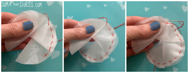 Fold the second circle in half and overlapping it with the first continue the running stitch through all 4 layers.