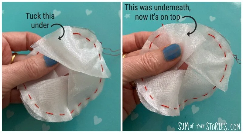 Flatten your flower a bit and then flip it over and look at the other side. Depending on the fabric sometimes I find these flowers look better if they are one way up and sometimes the other. You can easily push all the gathers through to the other side if needed. If they are squashed you can seperate the layers of organza a little, poof it up a bit until you are happy.