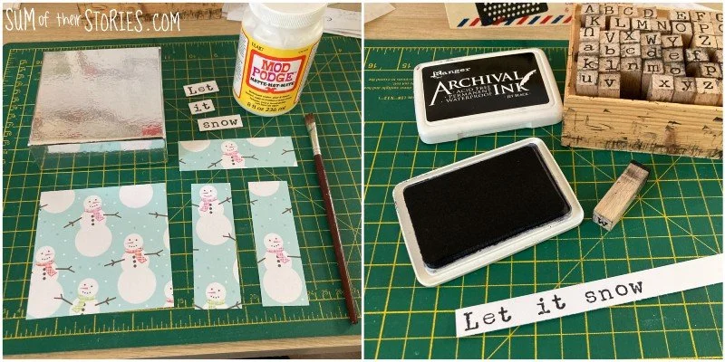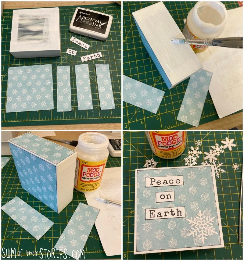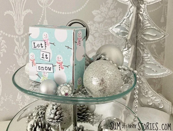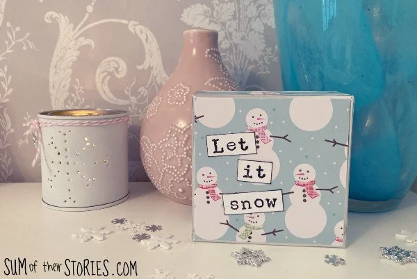 Glue the paper to the box using Mod Podge. Play around with the words until you are happy with the arrangement then glue them in place. I positioned mine to one side so that one snowman showed fully, without the words covering them at all.