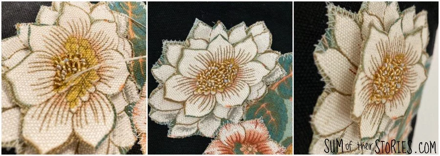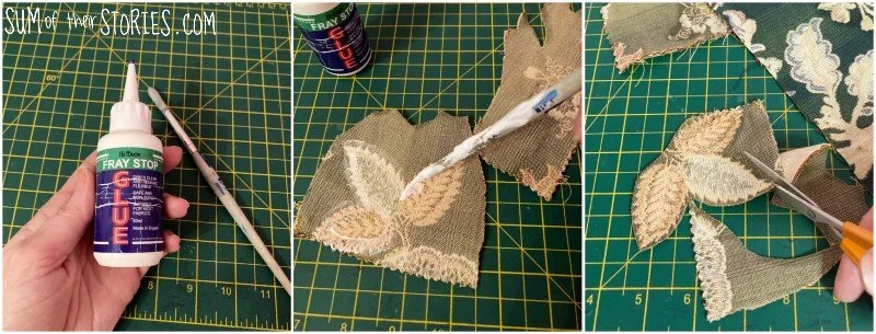 Some of these woven upholstery fabric fray like mad when you cut them so to prevent any fraying issues I used Fray Stop. I applied the Fray Stop all over the back of each motif going outside the lines of the motif onto the background fabric too. I left it to dry overnight and then was able to cut all the flowers and leaves etc out with no fraying. This Fray Stop stuff is supposed to be washable although I must confess that I’ve never tried to wash anything I’ve used it on. I’ll be totally honest here, it seems a lot like PVA glue so I think you could probably try substituting a PVA glue or Mod Podge without too many issues. Try it on a scrap of fabric first and see how you go.