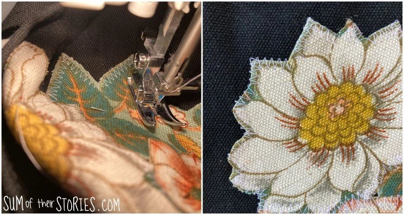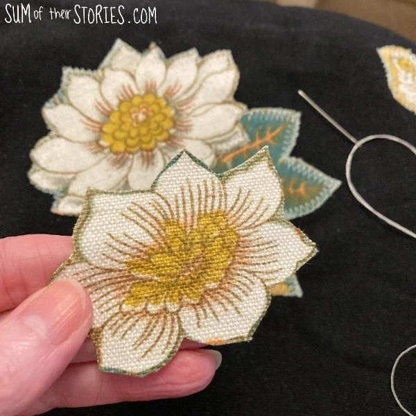 Now the bag had more sensible proportions I set about creating some floral embellishments with my upholstery fabric scraps. I’ve found some similar black bags on Amazon here if you don’t happen to have one in your stash like me!