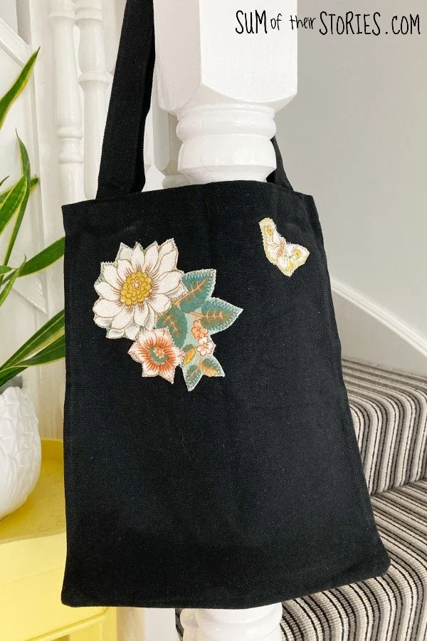 That’s it! All done! Some simple applique to give a plain bag a new look and to use some upholstery fabric samples from my stash.