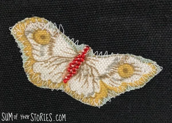 The top layer flower flaps round the edge, it’s only held in place in the centre by the beads. Whilst my beads were out I added a few red beads to the butterfly body too.