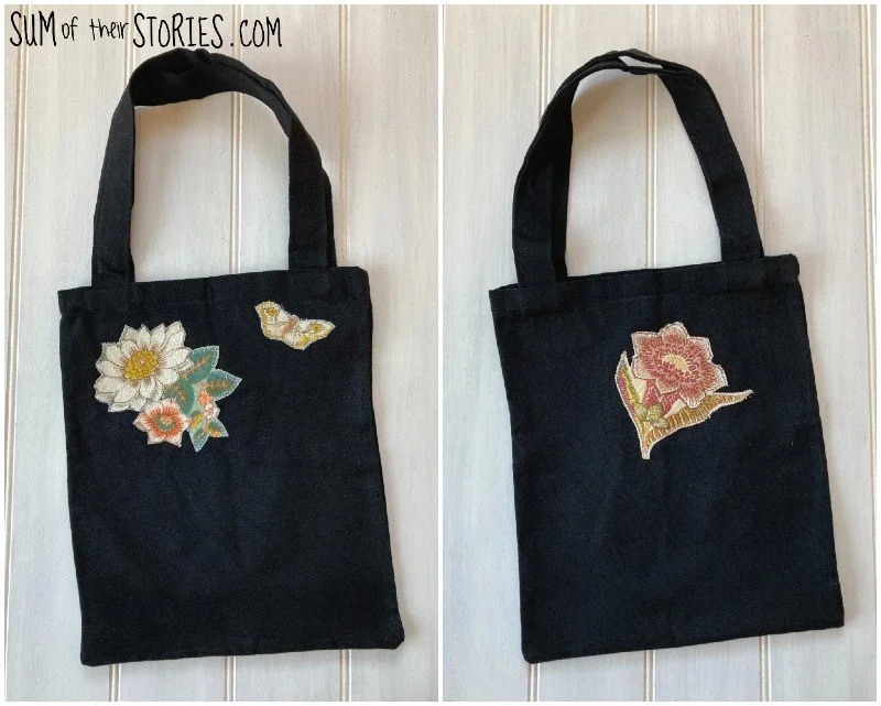 Because I was using a pre-made bag I kept the embellishments towards the top of the bag. I figured it could get awkward to sew the patches onto the bag if they were too close to the bottom and I didn’t want to have to undo the side seams or disassemble the bag in any way, kind of defeats the idea of using a premade bag if you do that right?