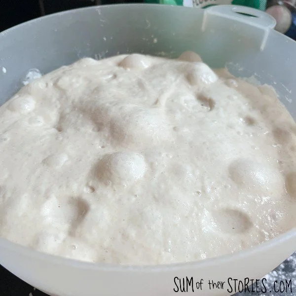 We had friends round for dinner last night and I couldn’t resist taking a quick photo of my nice bubbly dough yesterday morning. Looks like the surface of the moon doesn’t it?! It still amazes me when I get my starter out of the fridge and start to feed it up than it actually comes back to life like this.