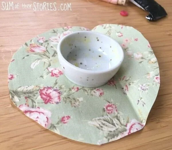 Place your container in the centre of the fabric and cut a circle which is bigger than the container. You want it to be just under double the height of the container bigger all the way round. My little ceramic pot is 1” high so my circle of fabric is just under 2” bigger than the pot all the way round.