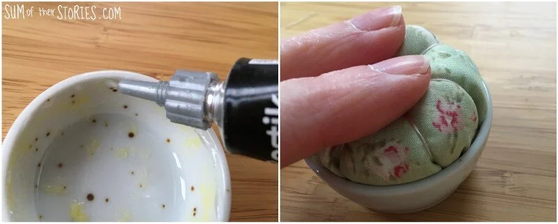 Press the fabric pincushion into the container and leave for the glue to dry.