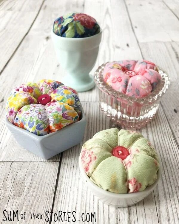 Why not have a look around the house and see what little containers you can find to turn into pincushions? If you don’t want to make your own I do have a small selection of pin cushions in my Etsy shop.