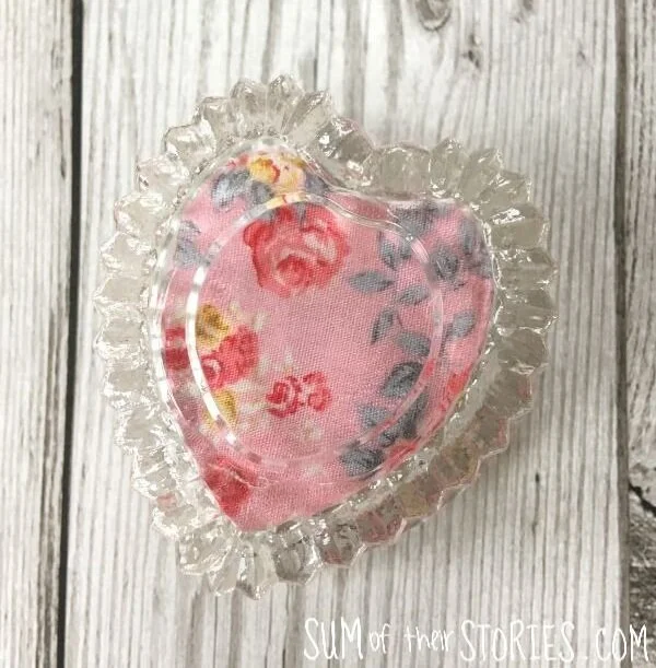 I used the same method as for the candle jar above for this heart shaped tea light holder, you need to cover the bottom so that your gathering stitches and fiberfill don’t show. You can read the full tutorial for the candle jar pincushion which explains what you need to do here: How to upcycle a candle jar into a pincushion.