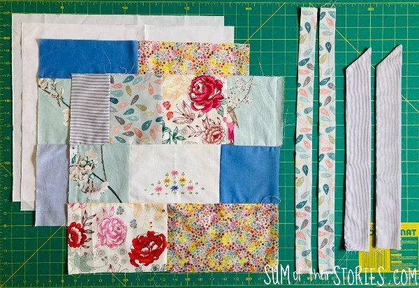 I rummaged in my scrap fabric box and found some pretty fabrics and set about making 2 pieces of patchwork to make into a pretty tote bag.