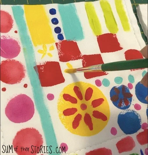 If you don’t have fabric paint you can mix acrylic paint with a fabric medium to turn it into fabric paint, but here all the colours I used were fabric paint.