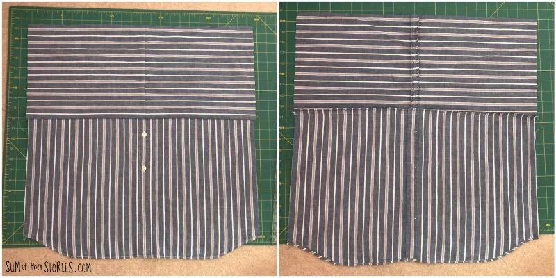 I stitched the button band closed as the lowest button was a little high for my liking. I pieced together 2 pieces from the sleeves and stitched that across the top with the stripes going in the opposite direction. I trimmed this “patchworked” section so it measured the same as the front piece; 22” x 23”.