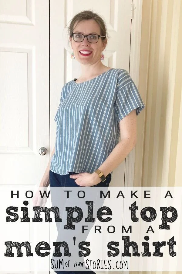 /Today I’ve got another refashion from an old men’s shirt. I took a large stripy men’s button down shirt and turned it into a boxy tee for me.
