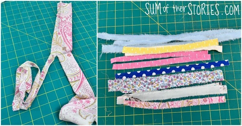 Start by tearing your pretty scrap fabric into strips. They can be any width you like but I found about 1 - 1.5 cm (around 1/2”) is about right.