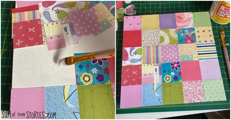 Cut plenty of squares and then spend a few minutes playing around with them, arranging them on the canvas until you are happy with the mix of colours and patterns. Then use the Mod Podge and brush to glue each square in place.