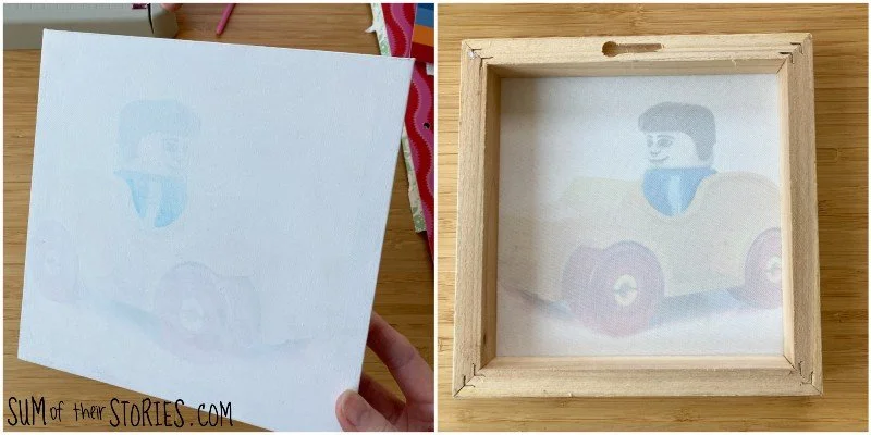 I had given it a coat or 2 of white paint a while ago. I have a vague recollection of an idea I had for it, but when the original print on the canvas was stubbornly showing through all my layers of paint I abandoned it. You can see the original print better from the back, some sort of lego man in a car by the look of it? None of this matters because we are going to cover it completely anyway.