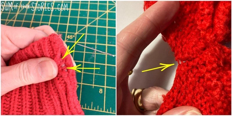 No matter how careful you are you will most likely have at least one point where you caught the knitting and pulled or snipped somewhere that you shouldn’t have. No worries, just sew up any loose threads and unconnected knitted stitches. You can use the lengths of yarn you’ve just unpicked if you managed to save them. Or maybe unravel a little of the removed sleeve to use that yarn so it’s a perfect match.