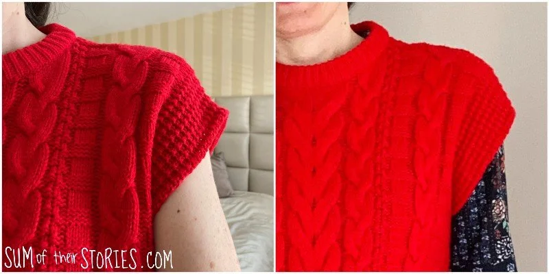 I took a length of the saved yarn and threaded it onto a needle. Then starting half way up the armhole, I stitched the thread all the way round the top and back down the other side, again to the halfway point. It doesn’t show at all as it’s the same yarn and it’s easy enough to adjust its length, just making it tight enough so it is pulling that top seam down just a fraction. Then I secured it at both ends and sewed the ends in of course. By only adding this “holding” yarn around part of the arm hole it’s still stretchy and doesn’t restrict your arm movements.