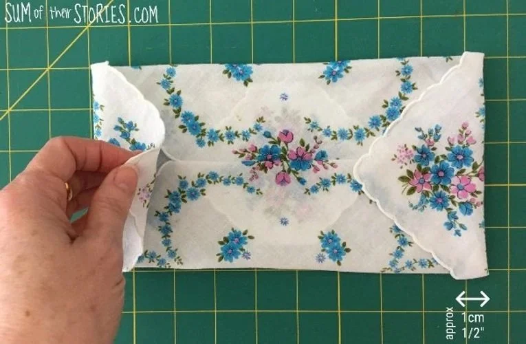 If you sew with old handkerchiefs you will find that they are not always a perfect square. You can see in my photos that my pouch is a little lopsided at times, with the overlap being slightly larger on one side than the other. Once your pouch is finished you really won’t be able to tell.